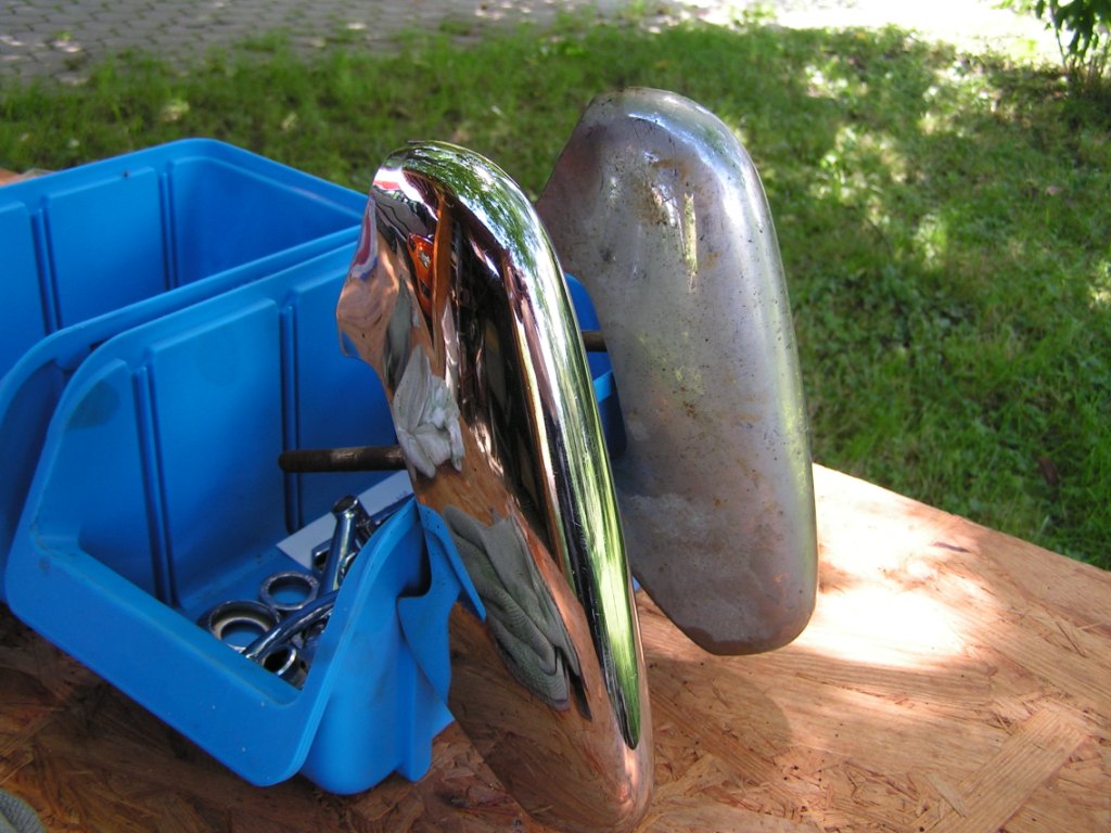 und wieder wird gearbeitet, wir haben noch immer Juni 2014 (parallel dazu entwickeln wir gerade neue Ideen, aber dazu kommen wir noch später - vermutlich im Spätsommer 2014). Juli: Wir beginnen mit dem Restaurieren verschiedener Teile (Chrom) wie z. B. die Stoßstange und Türgriffe
