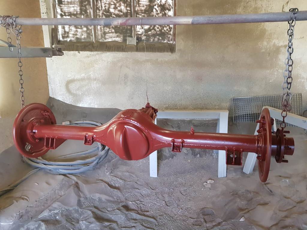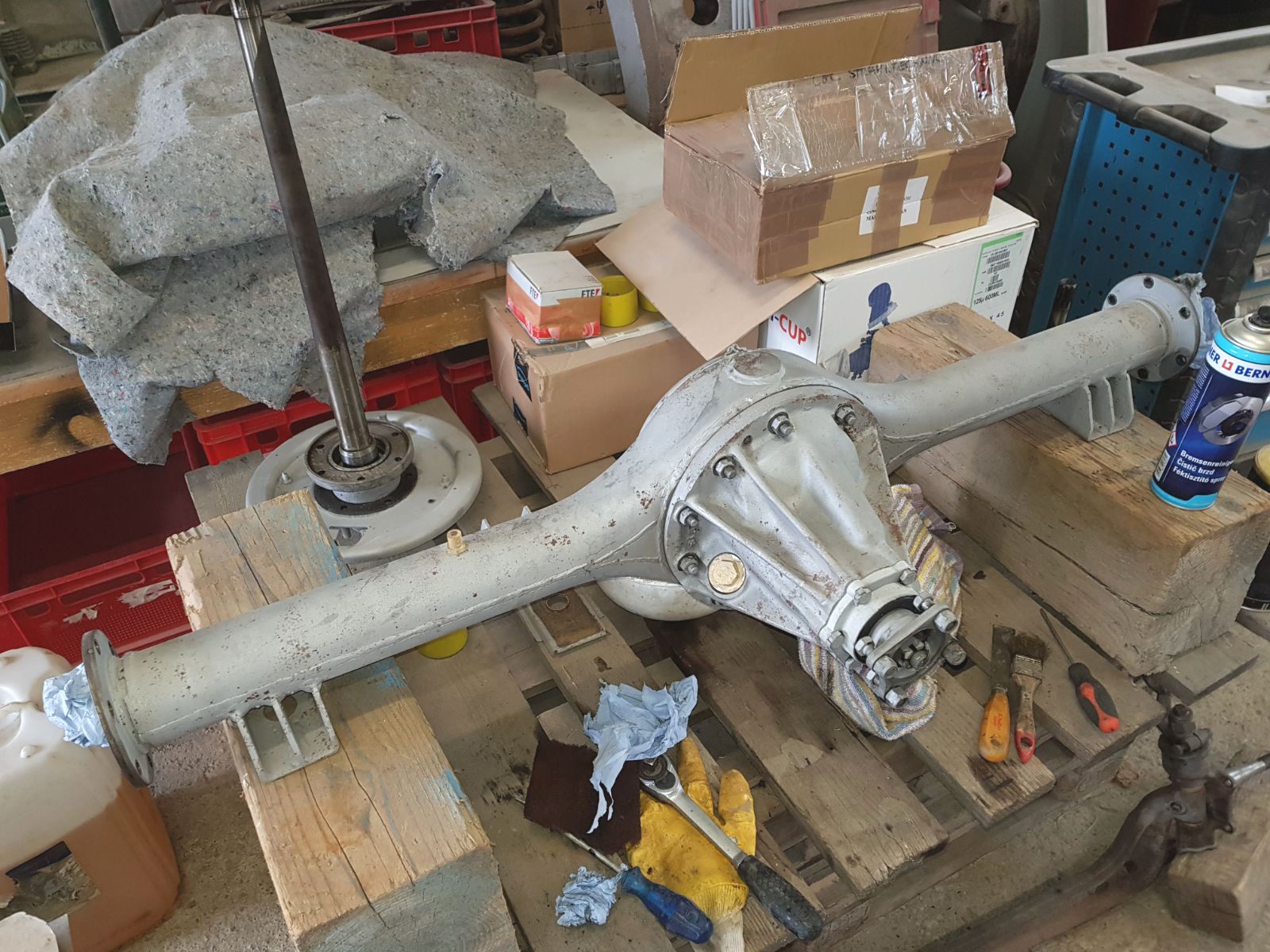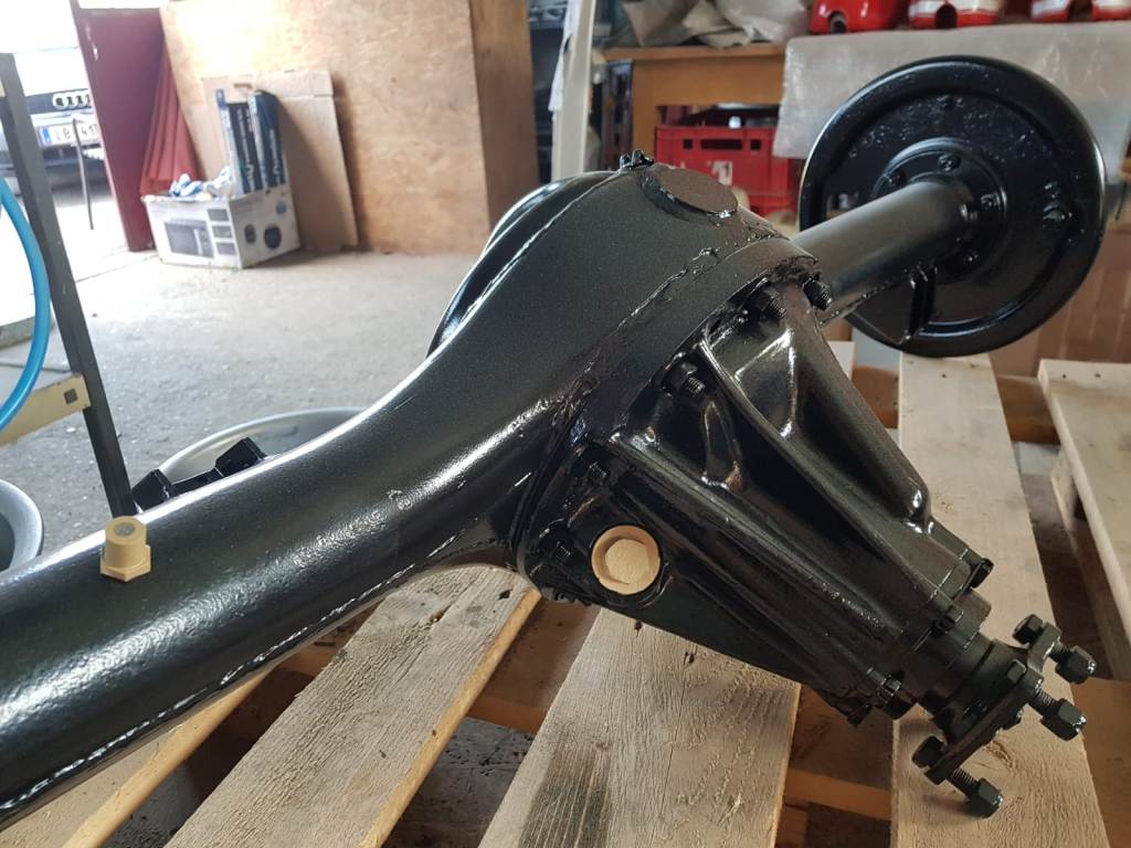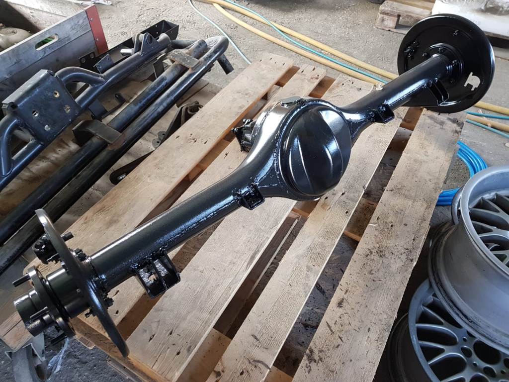 | Teile der Vorderachse werden gestrahlt, | ... lackiert und zum Zusammenbau vorbereitet ... |